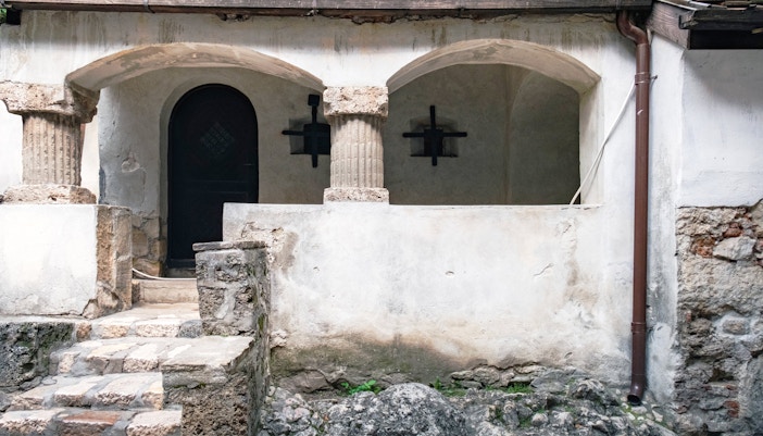 Atraviesa el arco norte, tallado con el escudo de armas del castillo y herrajes hechos a medida. Este Gateway marcaba el límite entre los espacios públicos y privados en la época medieval.